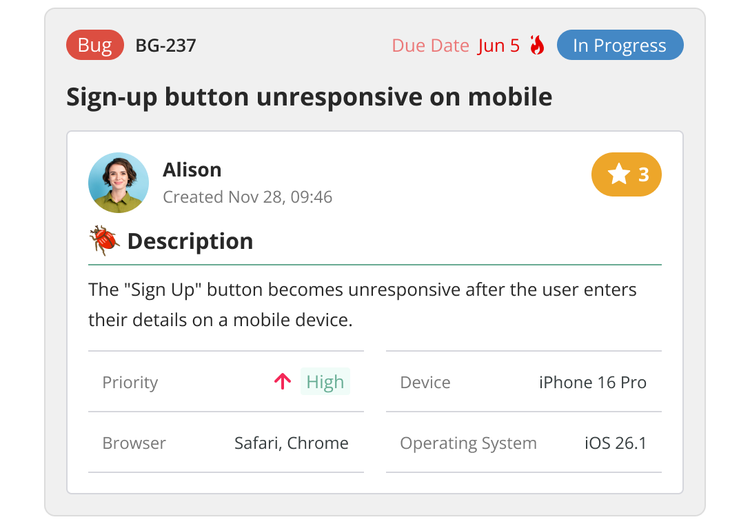 Include screenshots or screen recordings to show the exact issue, and keep conversations organized with thread-based comments.