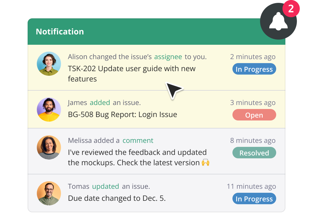 With targeted notifications, status changes, and in-issue commenting, you'll never miss another update again.