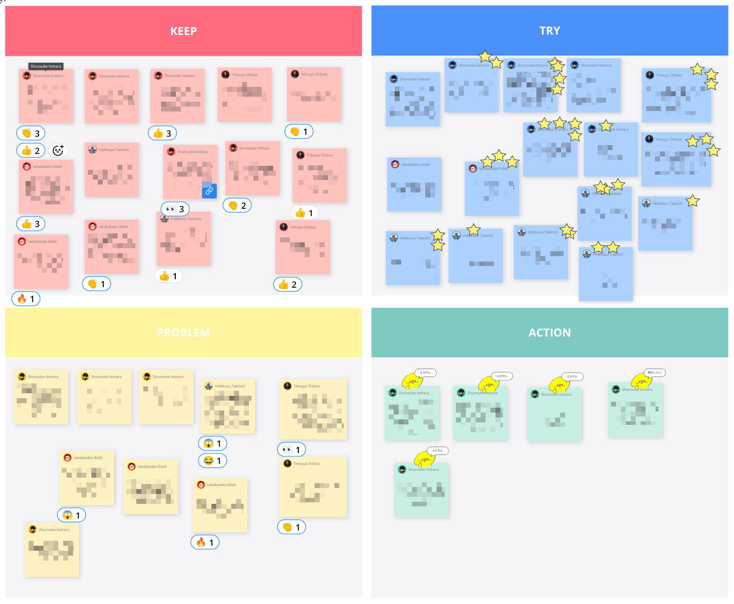 「Keep(良かったこと)」で今回の成功体験を称え合うだけでなく、「Problem(課題)」として挙がった進行上の反省点に対しても、その場ですぐに具体的な「Try(次やること)」へと昇華させることができました。
