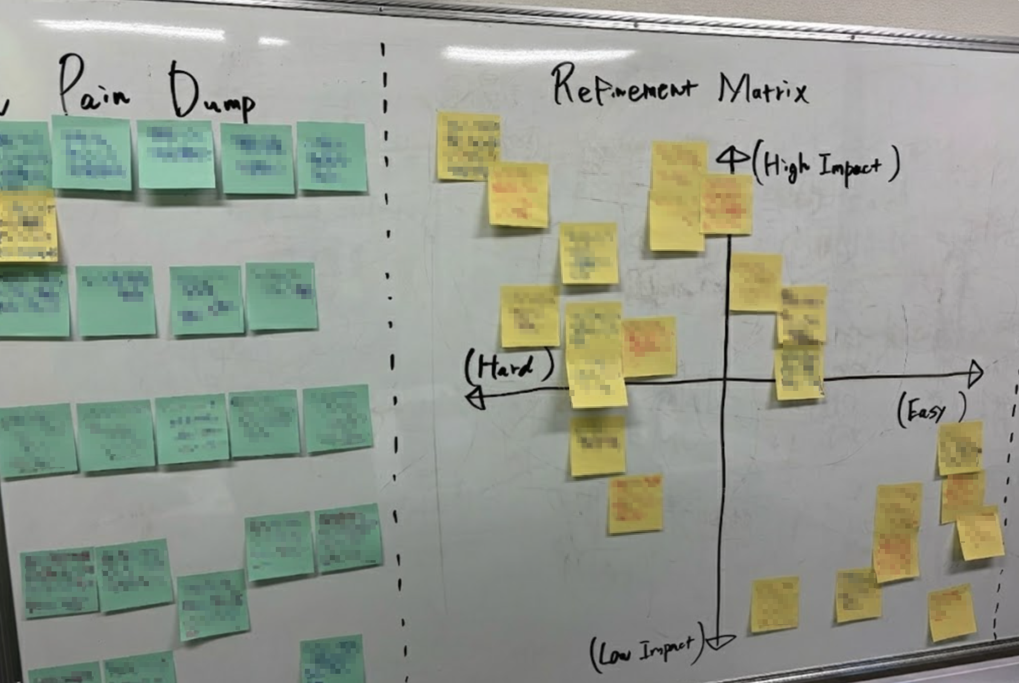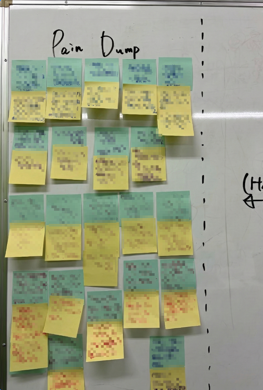 - Pain Dump(課題の洗い出し) を青色の付箋で課題を発散させ、黄色の付箋で解決策のアイデアを書き出してもらいました。
