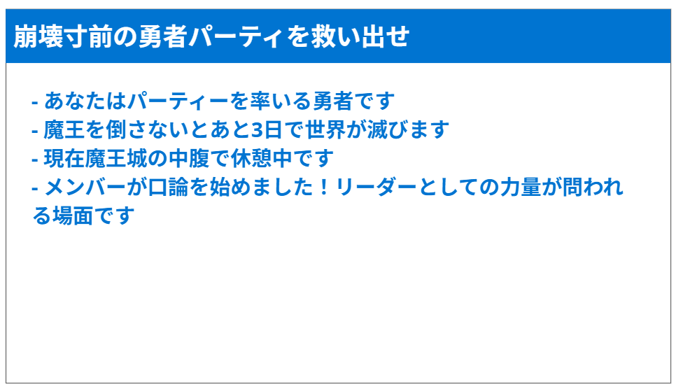 PjMのトラブル対応について考えるワークの説明シート(一部のみ)。全員が勇者(PjM)としてどうすればプロジェクトを成功させられるかを考えました。