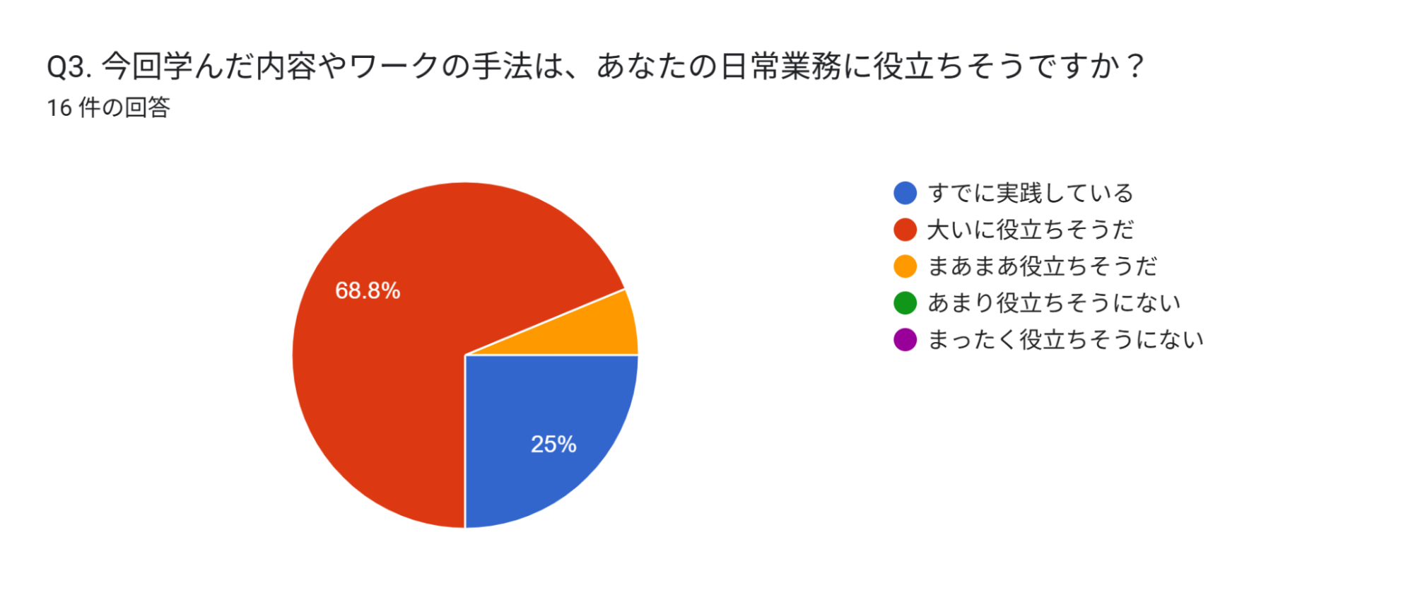 ほとんどの人が「既に実践している」または「大いに役立ちそうだ」と回答し、「あまり役立ちそうにない」「まったく役立ちそうにない」と回答した人は0でした。