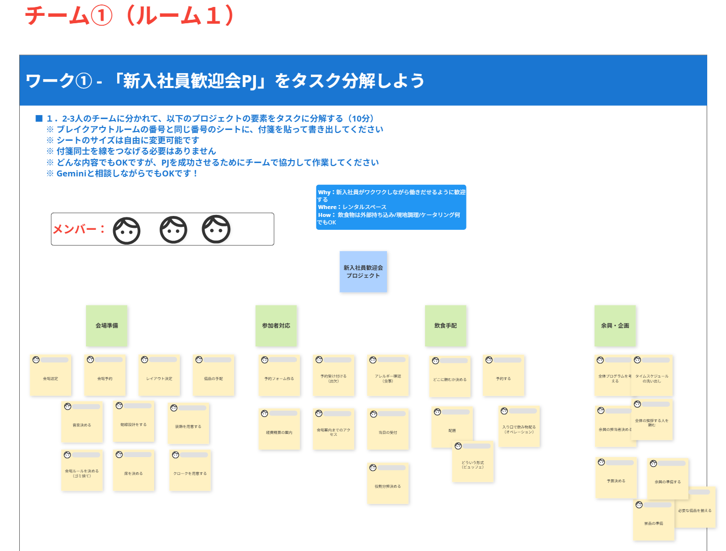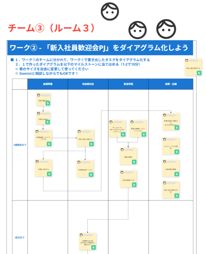 「プロジェクトの要素をタスク分解する」ワークの作業シート。2-3人のチームに分かれ、Cacooの付箋機能を使って「新入社員歓迎会プロジェクト」をタスク分解してもらいました。※実際の作業時には各自のユーザーアイコンや名前を表示しています。