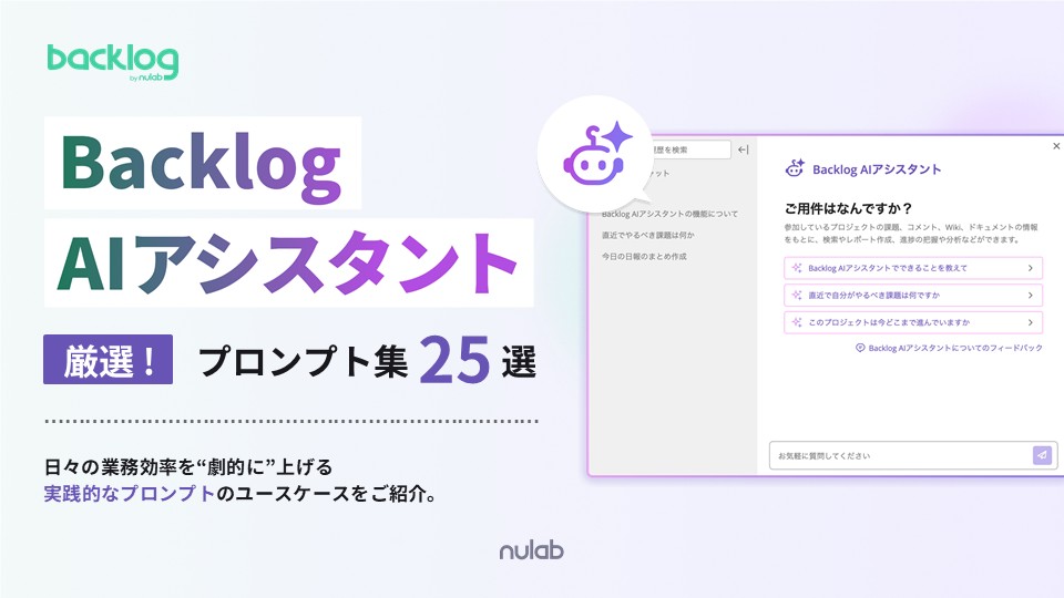 株式会社ヌーラボ(本社:福岡県福岡市、以下 ヌーラボ)は、プロジェクト・タスク管理ツール「Backlog」に搭載された運用支援型AI機能「Backlog AIアシスタント」をより効果的に活用するための「プロンプト集25選」を公開しました。
