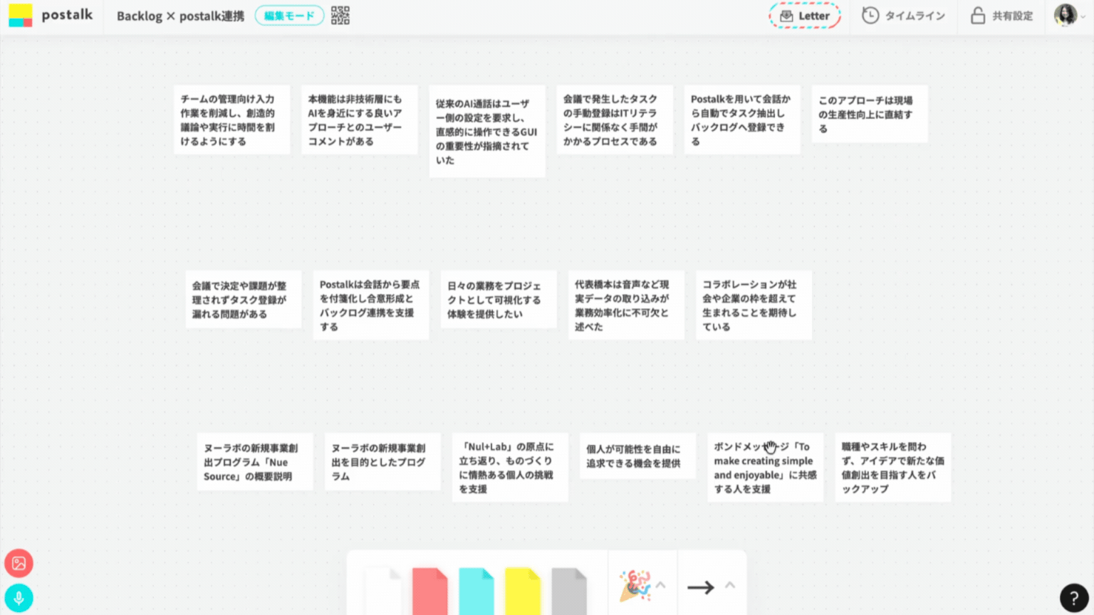 - 付箋による構造化と整理:抽出された要点をpostalk上の「付箋」として展開。
