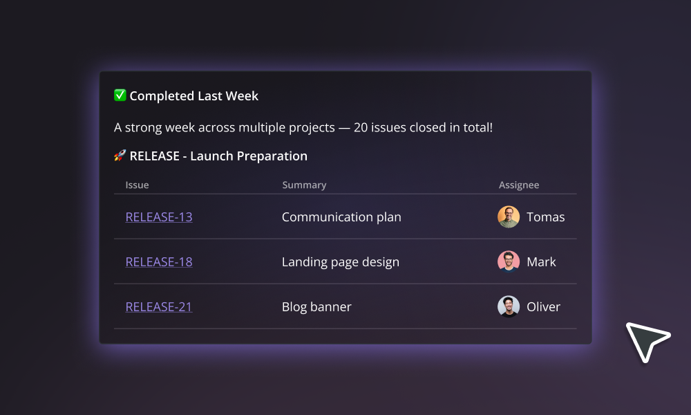 Example: Instead of scrolling through comments, generate a summary and see what’s blocking progress right away.